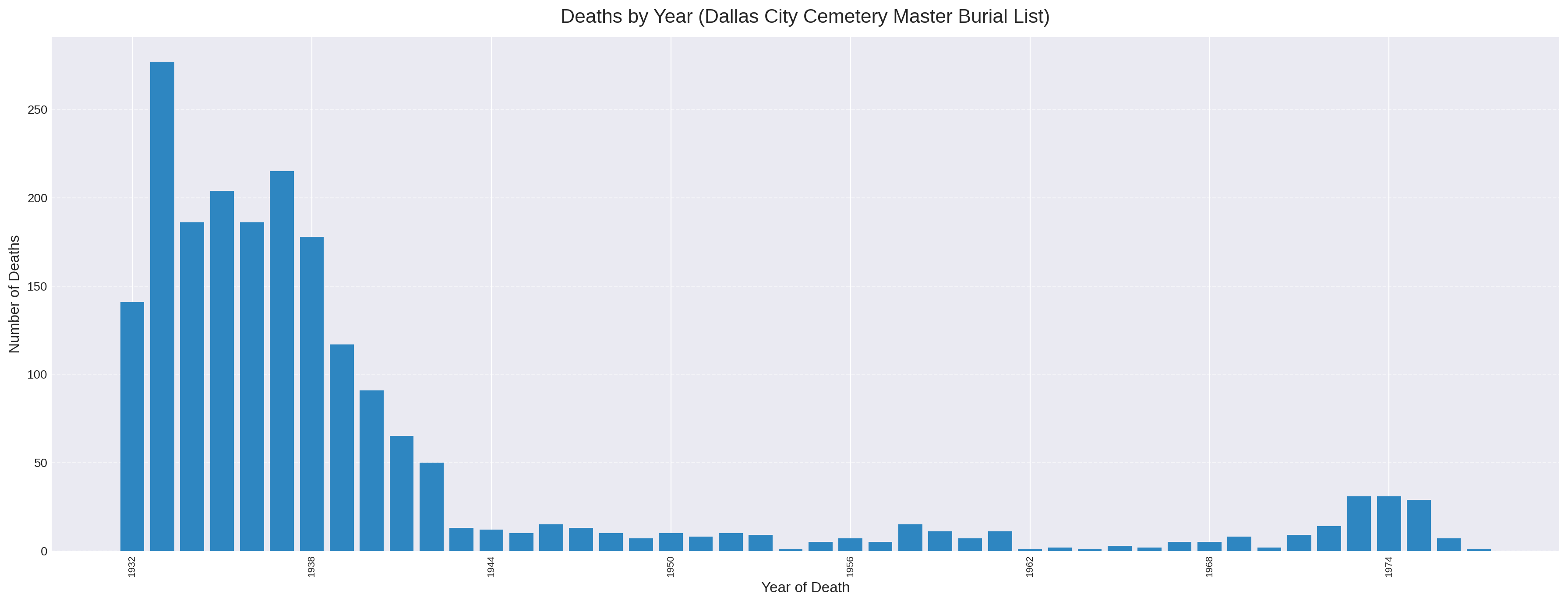 A staggering 84% of all burials occurred in the cemetery’s first decade, from 1932 to 1942 — years defined by the Great Depression, widespread poverty, and the absence of modern medical care. As prenatal care progressed, antibiotics emerged, and tuberculosis treatments improved, the burial rate dropped sharply. The cemetery’s population is a demographic snapshot of a city in crisis, then in transition.