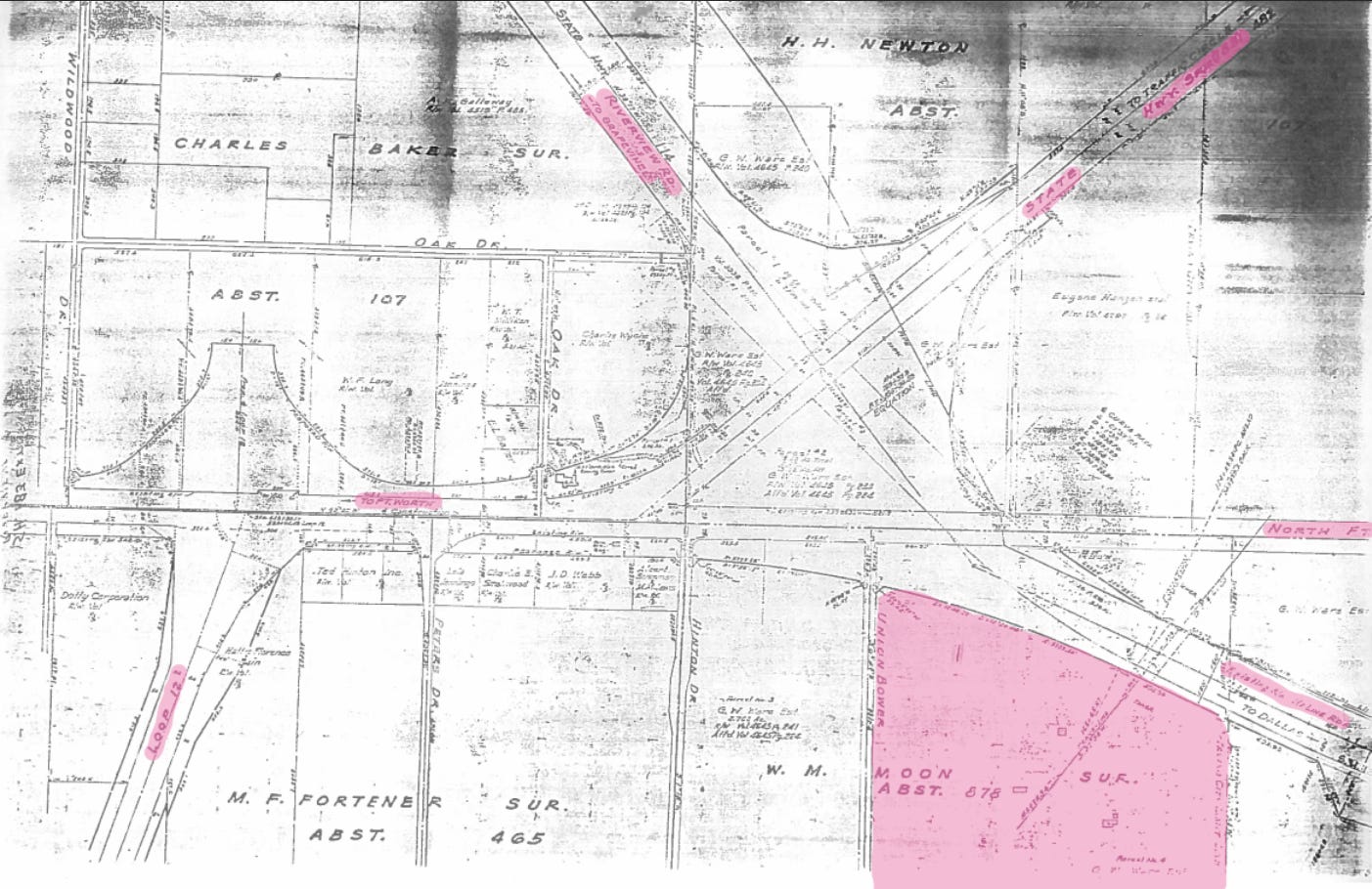 Curious readers will note that the left side of the property borders Hinton Dr. This street was standardized as Denton Drive and was influenced by the adjoining railroad corridor since it paralleled the line toward Denton County.