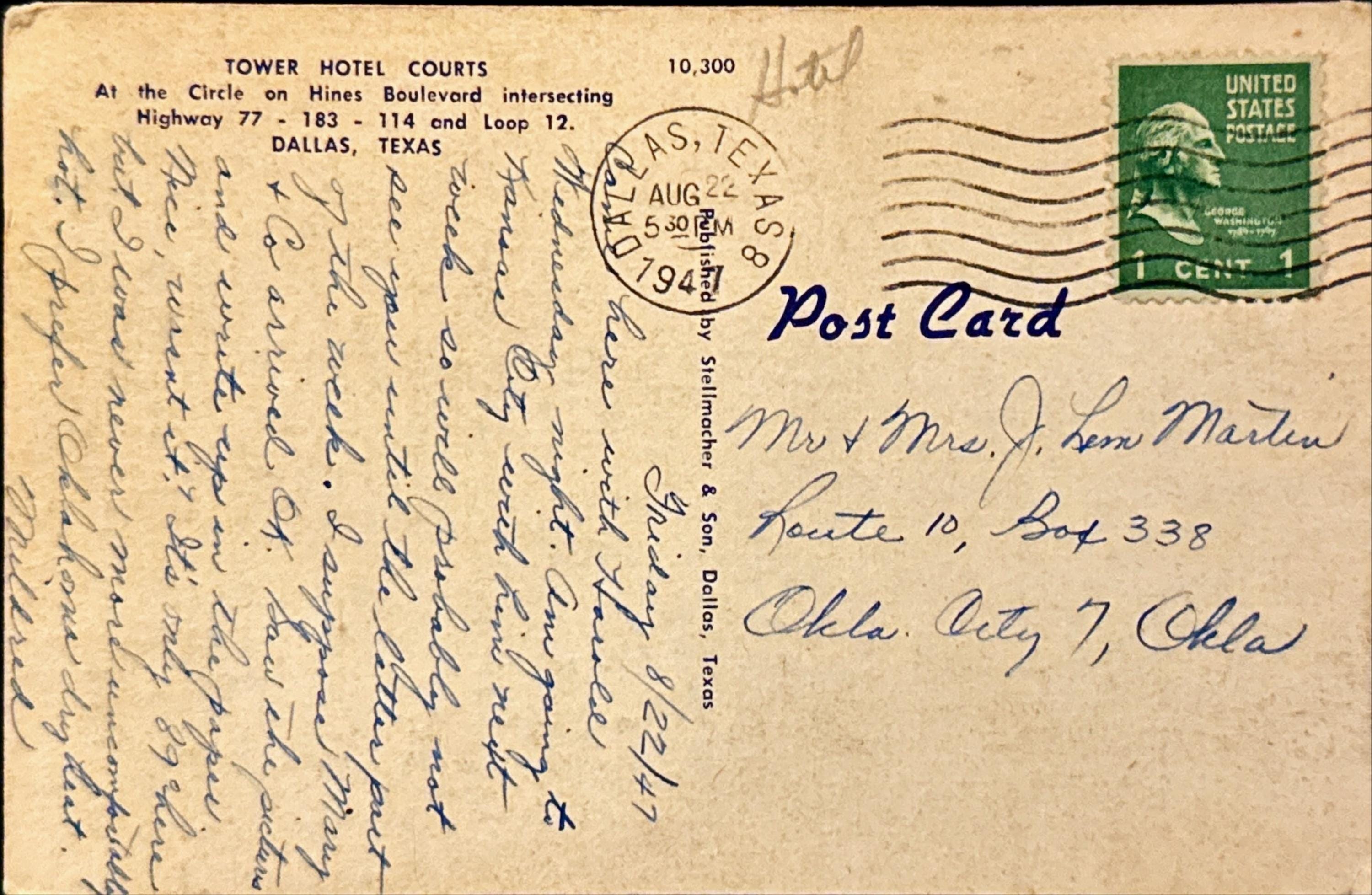 On a Friday in late August of 1947, Mildred sat at the Tower Hotel Courts and wrote a postcard home. She mentioned something that would surprise anyone who has lived through a Dallas summer.