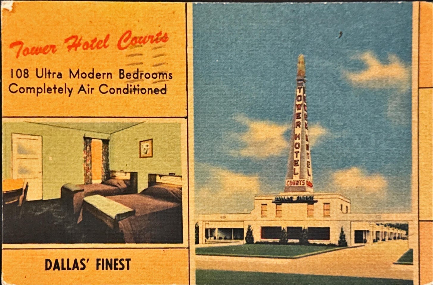 The Tower Hotel Courts opened around 1940 on land carved from the G. W. Ware Estate. It sat between the railroad and Harry Hines, just south of the future Circle. It was a classic motor court of its time, with rows of individual cabins, a central office, bright neon, and the promise of one hundred eight modern, air-conditioned rooms.